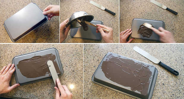 Tomar templado chocolate y verter sobre hornear doblados hacia arriba. Usando un cuchillo de hielo esparcir chocolate uniformemente sobre hornear, aproximadamente 6mm (1/4") de espesor.
