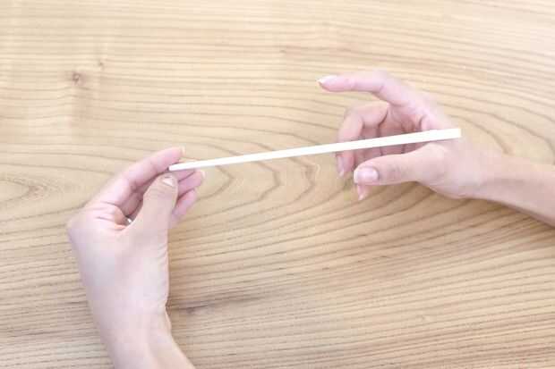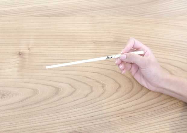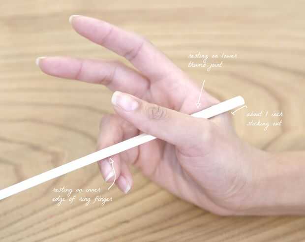 Tomando sólo un palo y con la mano dominante (aunque en la tradición China, incluso si no están bien de manos, todavía utilizar esta mano para comer con) colocan el extremo más estrecho como si fuera la punta de un lápiz. Ajustar el palo tan sólo aproximadamente que una pulgada del extremo más grueso se está pegando fuera de la zona entre el dedo índice y el pulgar. La articulación inferior del pulgar ayudarán a estabilizar este palo. Ahora el lugar más reducido final (pero no la punta, sí) para que quede un poco en el interior parte de su dedo anular, liberando totalmente el medio y el índice de explotación en el palo.