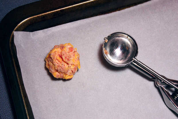 Use una cuchara para galletas a las bolas de salchicha uniforme de forma.