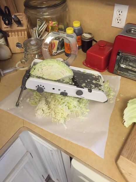 Usando una mandolina, ajuste la hoja al tamaño deseado (yo uso un pequeño a medio corte). Empezar a afeitar su col desde un borde para conseguir una pizca más deseada.