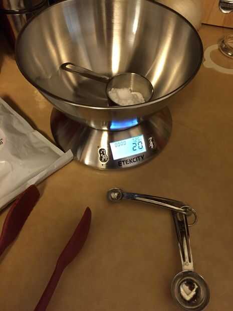 Encienda la báscula y tara / cero el peso con el tazón de fuente grande en él. Luego agregar la col para obtener el peso (Recuerde que establecer la escala de lectura en gramos).