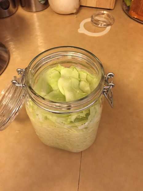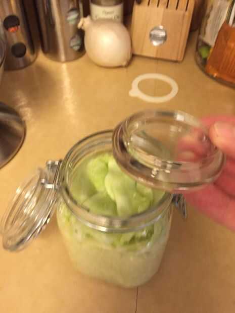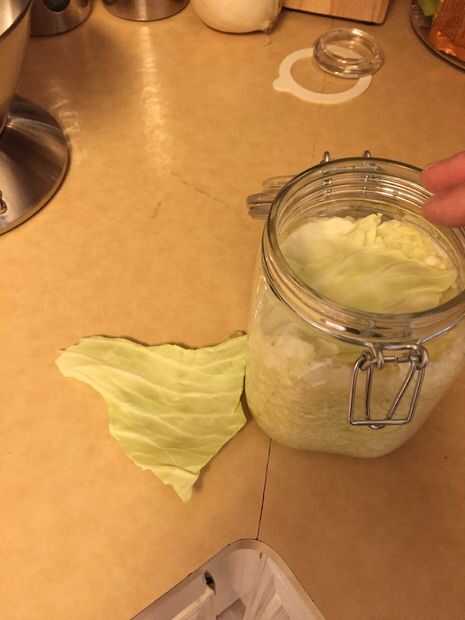 Con las hojas exteriores de la col guardado y lavado en el paso uno. Cortar en tamaños viables para cubrir el repollo en el recipiente. La idea es que las hojas le ayudará a celebrar la col en el líquido durante la fermentación. Se desea sobre una capa de tres hojas en la parte superior. En este momento necesita un objeto pesado para ayudar a sostener la col bajo el líquido. Utilizar un peso de vidrio que me puse con mi barco. Se podría utilizar una roca bien lavada o algo de ese tipo. Dar unos buenos empuja para conseguir el líquido y cubrir todo.
