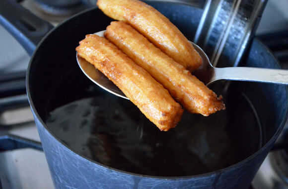 Tubo de la pasta sobre el bote de aceite para una longitud de cerca de 4 pulgadas, luego con unas tijeras o un cuchillo afilado, corte por lo que libera en el aceite. (Soporte a evitar cualquier salpicaduras.) Tubería de dos a tres churros en el aceite a la vez, los fríe hasta que están dorado y cocido. Transferir los churros a la placa de forrado de toalla de papel para drenar durante 2 minutos, luego rodillo en la mezcla del azúcar de canela. Repita el proceso de fritura y la capa con la masa restante.