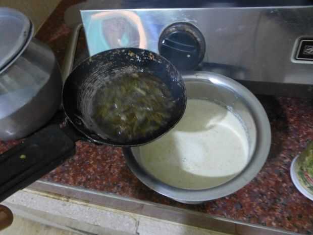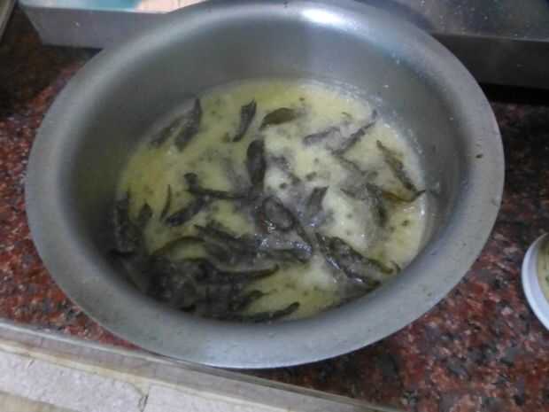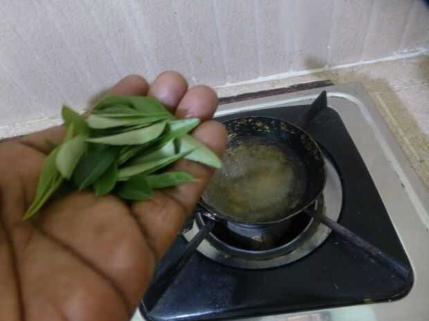 • Cuando las semillas de mostaza empiezan a agrietarse, añadir un puñado de hojas de curry y dejarlos freír durante unos segundos.