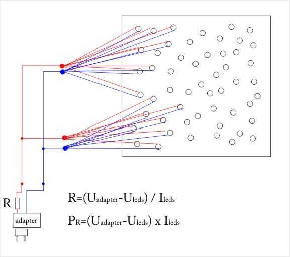 En cuanto a los valores de la resistencia en ohmios, usted no irá mal si toma 10-15% mayor valor que el calculado, porque esto reduce la corriente a través de los LEDs e incluso prolongar su vida. Cielo estrellado va a brillar un poco menos, pero sin duda lo usará como un sistema de iluminación decorativa