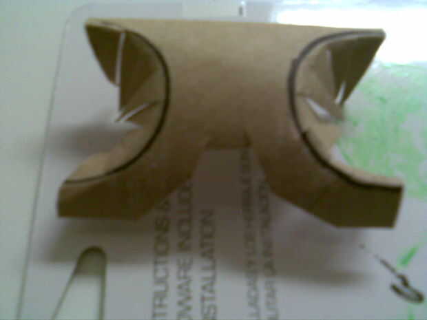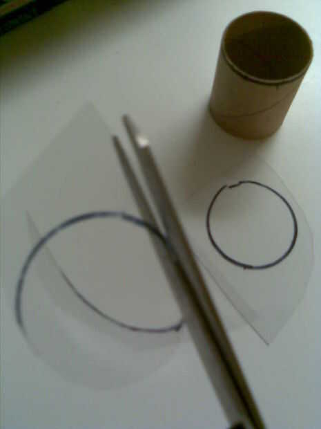 Mientras estos se secan, ir raíz a través de la papelera hasta que encuentre un paquete de plástico desechado. Usé la parte plana de un paquete que contenía los auriculares. De esto se corte lentes uno de tus corazones de papel higiénico utilizando como guía de corte (ver tercera imagen). No se olvide de corte dentro de las líneas de guía para que la lente no será más grande que el ocular (ver cuarta imagen).