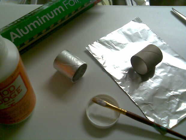 Capa exterior de los segmentos de cartón en Mod Podge y envuelva una capa de papel de aluminio alrededor de ellos. (ver segunda imagen).