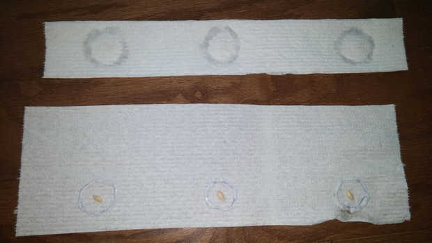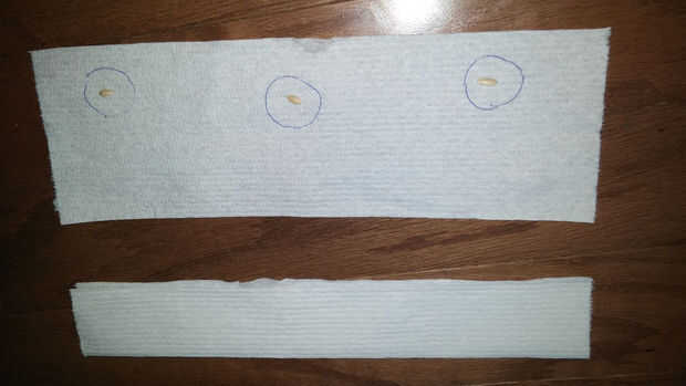 Para estas semillas de pepino, una franja de 3 a 5 cuadrados de papel higiénico y doblar por la mitad longitudinalmente. Puede utilizar una tira más larga, pero puede ser más difícil de manejar, y no hay ninguna ventaja en tener una tira de tres tiras de vs de 9 semillas de 3 semillas.