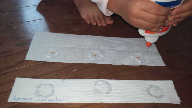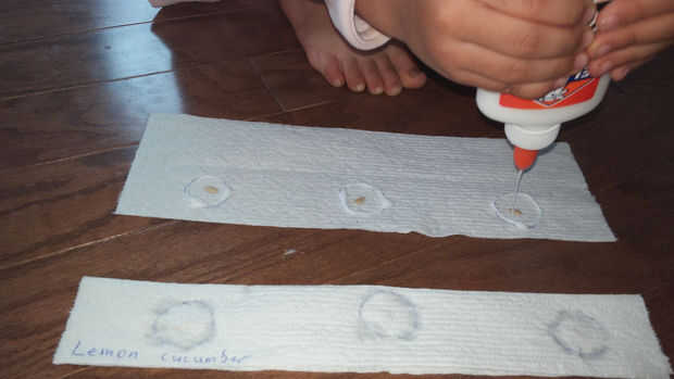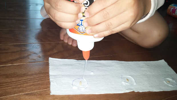 Dibuja un círculo con el pegamento. No tienes que dibujar con la pluma Sólo lo hice para mostrar mi pequeño ayudante donde debe ir el pegamento. Asegúrese de que haya ningún espacio en los círculos para que no caiga su semilla.