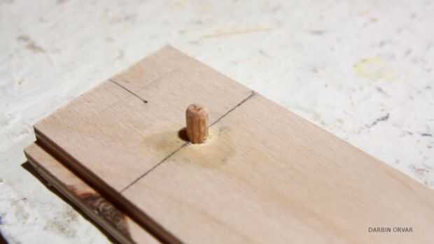 A continuación, quitar la corredera de centro, y quiere asegurarse de que usted no consigue ninguÌ n pegamento en eso. Pongo una marca en el centro, 1 1/2 pulgadas, y luego perforé un agujero poco profundo de 1/4 de pulgada. También, marque una línea a través del agujero con un lápiz porque lo hará mucho más fácil alinear cosas más adelante si tienes esa marca. A continuación, pegue en la espiga.