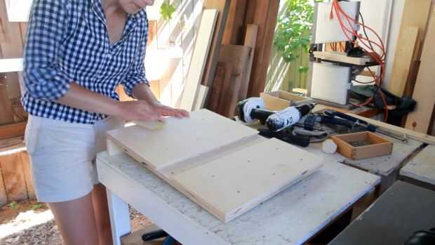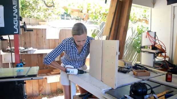 OK, ahora vamos a colocar el bloque de tope, corte F en el lado. Asegúrese de avellanar y aquí estoy utilizando algunos tornillos de 1 1/4 de pulgada.