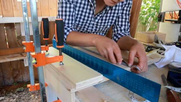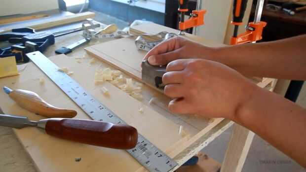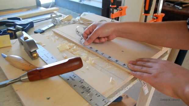 Ahora, con el fin de colocar la cinta métrica, es una buena idea crear una sangría por lo que puede poner plana. Así que marcan el ancho de la cinta, y estoy poniendo hasta en el borde al lado de la vía de deslizamiento. Marcar con un cuchillo, use una escuadra de enmarcar y asegúrese de obtener una buena ranura creada con el cuchillo. A continuación estoy usando un plano de hombro, sin embargo también podría tomar muy poco profundos cortes en una sierra de mesa, o el uso de un cincel. Una vez que la ranura era sólo lo suficientemente profunda como dejar la cinta métrica en posición plana, puse en el cemento de contacto en ambas superficies, esperé unos 40 minutos y entonces Unido.