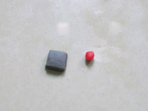 La arcilla gris y forma rectangular un poco en el botón de base. Luego tomar un poco de arcilla roja y hacer una forma de bola. Luego poner la arcilla roja en el barro gris. (ver imagen 3)