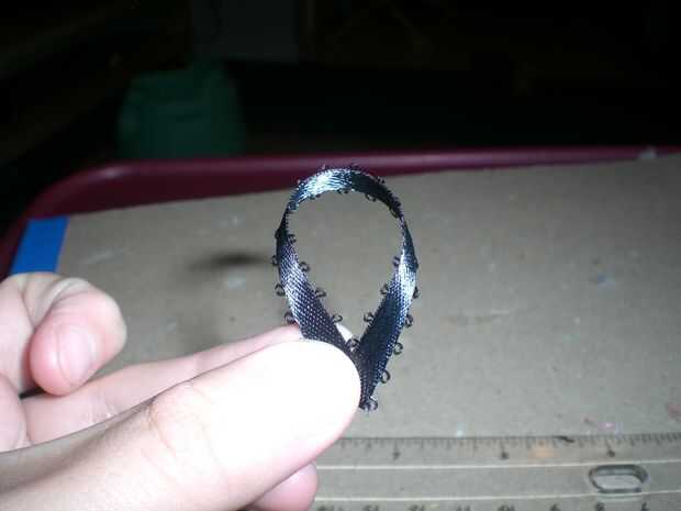Tomar y doblar la cinta con los extremos cortados de reunión. Pegamento caliente los extremos juntos como se muestra en la imagen. Hacer esto para todas las tiras.