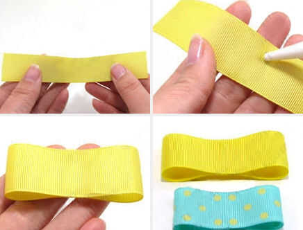 Cortar una cinta de grosgrain en color puro y la otra cinta con puntos de 14cm; dobla la cinta de la primera mitad. La línea central y la cola 1cm de ancho. Doblar los dos extremos a la línea central. Hacer lo mismo con la segunda cinta.