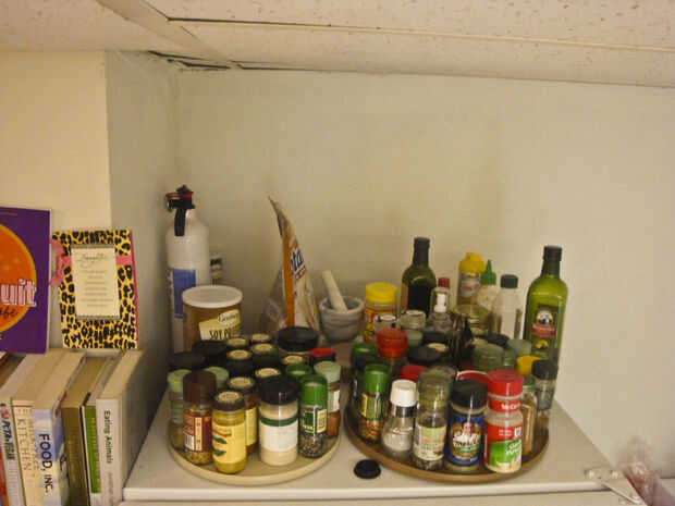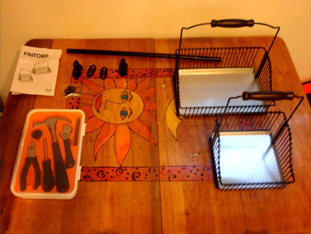 -Algunos tipo de estantería. SER CREATIVO! Esto podría ser lo de un repintado estante de una tienda de segunda mano a un estante de especia comprada de The Container Store. Piense en su espacio, recursos y lo que te gusta. Piense en todos los aspectos del diseño, también. Si está usando un estante, pensar en lo que se puede colgar de la parte inferior de la plataforma para aprovechar al máximo... Usé un ordenado estante que compré de IKEA. Es algo así como una barra de toalla con cestas colgantes. Aunque barato de IKEA, sería muy fácil y divertido para recrear con más personalidad de un toallero real, canastos y ganchos en S.
