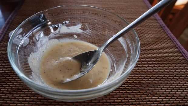 2. lentamente Vierta la harina. Se hace gelatinoso. Mezclar hasta que la consistencia es incluso en todas partes.