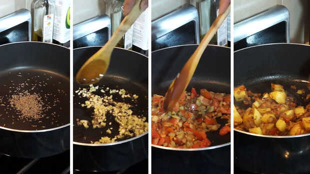 Tueste las semillas de comino en una sartén grande a fuego medio alto durante 1 minuto aproximadamente llevar a cabo su sabor nuez. Añadir aceite de oliva, cocinar por otro minuto. Añadir el ajo picado y el jengibre, cocinar por 1 o 2 minutos antes de agregar la cebolla. Tapar y cocinar la mezcla de cebolla durante unos 5 minutos, revolviendo una vez o dos veces en el medio hasta que doren ligeramente. Si utiliza cúrcuma fresca, agregar ahora. Tumérico molido puede ser agregado con el resto de las especias más adelante. Agregar los tomates picados a la mezcla de cebolla y cocinar por unos minutos hasta que los tomates ablandarán y empezar a mezclar. Ahora añadir patatas y mezclar bien; Cubra la olla y deje papas cocinar de 3 a 4 minutos para que se ablanden ligeramente antes de añadir las verduras. Puede Agregar un poco de agua si la mezcla empieza a pegarse al fondo de la cacerola.