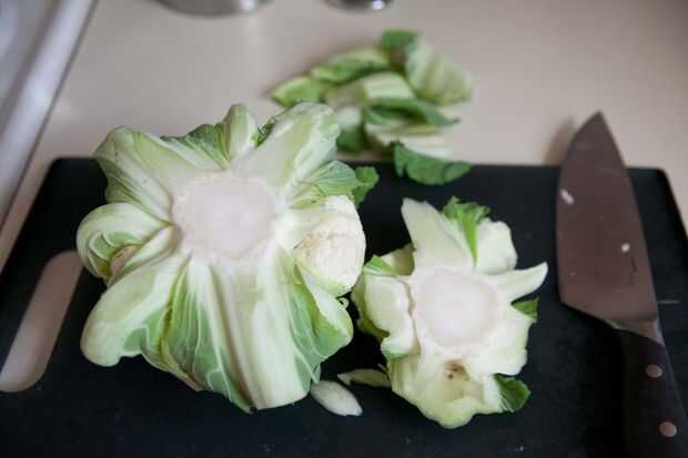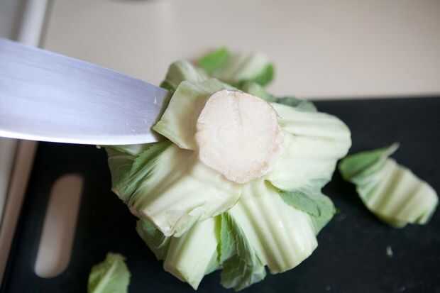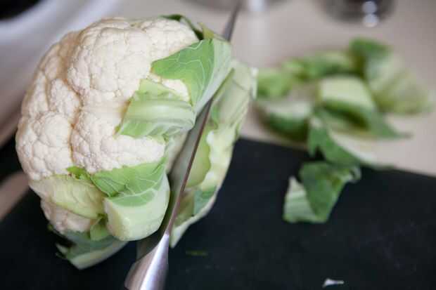 Los floretes de la coliflor todo grueso se conectan a la raíz. Eliminación de la raíz revela las ramas que se pueden cortar para convertirse en los flósculos.