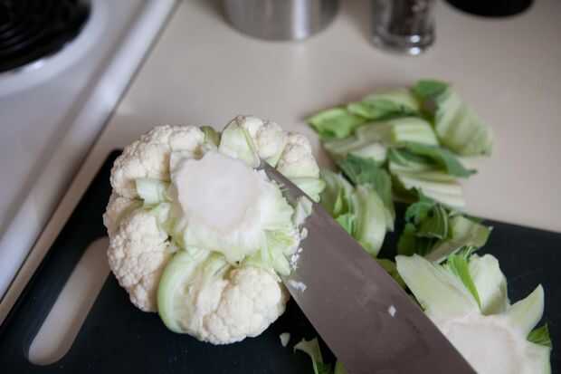 Cortar una coliflor en pequeñas raciones similares y ensamble de cola en la parte superior, paso a paso. La coliflor debe ser fresca a última por más tiempo. Tomar una coliflor fresca. córtelo en piezas pequeñas pequeñas manteniendo el vástago de la