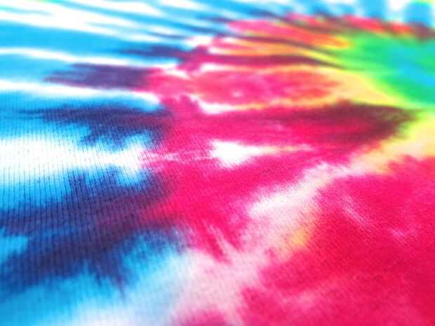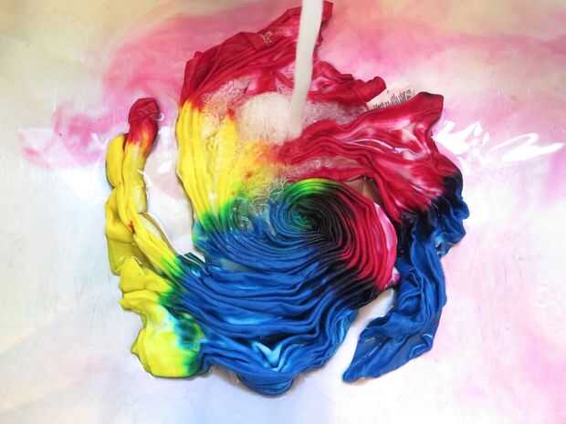 Mientras que algunas instrucciones sugieren uso de cadena creo que bandas de goma funcionan mejor. De cualquier manera, lo más importante es que te diviertas preparando una camiseta vieja para su transformación en una obra maestra del arco iris.