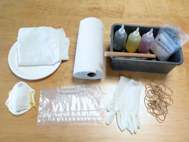 Si eres como yo y no se utiliza un kit pre-empaquetado, se necesita lo siguiente; Tinte Procion, bandas de goma, guantes de goma, botellas exprimibles para el tinte, urea y carbonato de sodio, bolsas ziplock grandes, una tina de remojo de las camisas y una clavija de madera o algo similar para la creación de la torcedura en la camisa. Un embudo y una medición conciso son también útiles para mezclar el tinte. Oh sí, no olvides toallas de papel y platos de papel para mantener su camisa mientras que está siendo teñido y trapos viejos para absorber los derrames. Tie-muriendo no tiene que ser sucio!
