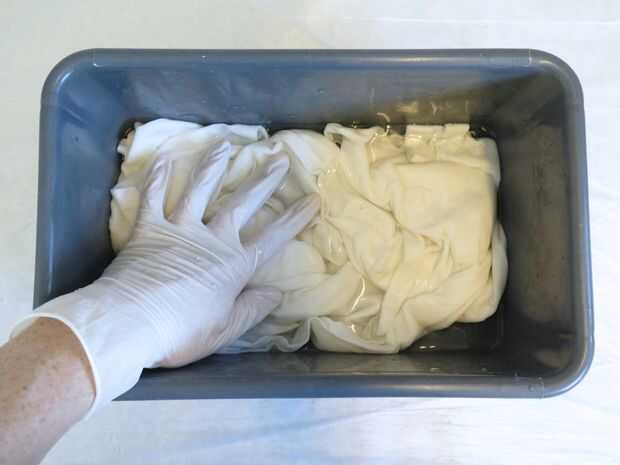 Para habilitar los tintes Procion enlazar con la camisa, necesitará sumergirlo en una solución de agua tibia y Sosa durante unos 10 minutos. Siga las instrucciones con la ceniza de soda para que usted tenga la mezcla correcta. No usar agua demasiado caliente o demasiado frío - y añadir un par de cucharadas de sal común a la mezcla demasiado!! Asegúrese de que la mezcla se disuelve completamente antes de agregar la camisa. La temperatura del agua debe ser de aproximadamente lo mismo que el baño del bebé! Como el carbonato de sodio es ligeramente cáustico que puede usar guantes de goma en este punto, especialmente si usted tiene un corte en el dedo - se pican! Después del remojo, escurra la camisa completamente. Cuanto más líquido que puede exprimir hacia fuera, el tinte más será capaz de entrar! Yo generalmente girar mis camisas en el centrifugado de la lavadora. (Nota: Si utilizas una camisa nueva, lavarlo primero para eliminar la novedad, que creo que llaman "tamaño". Este "apresto" evitará que tinte adhiera adecuadamente, y puede obtener un efecto rayado.)