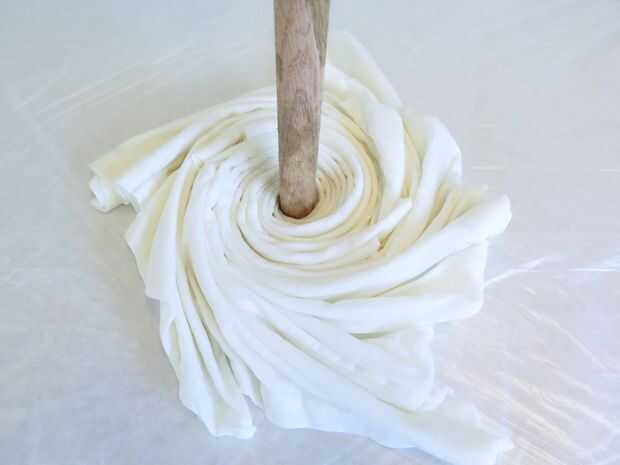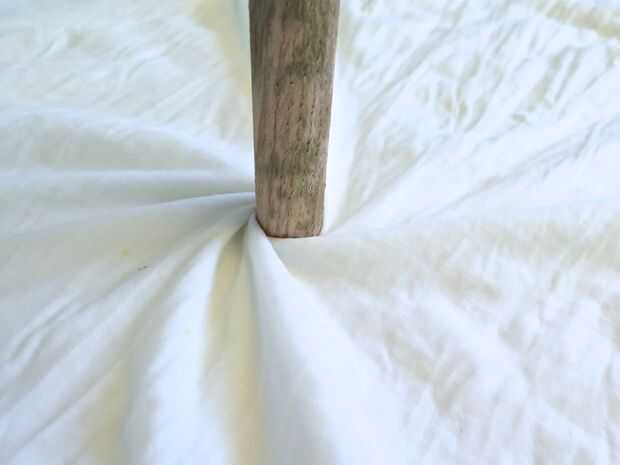 Coloque la varilla de pasador, (o el dedo o un alfiler de ropa madera) en el centro de la camiseta y empezar girando en sentido horario hasta que tenga una forma agradable pie plano. También se puede activar en sentido antihorario si se prefiere, no importa realmente.