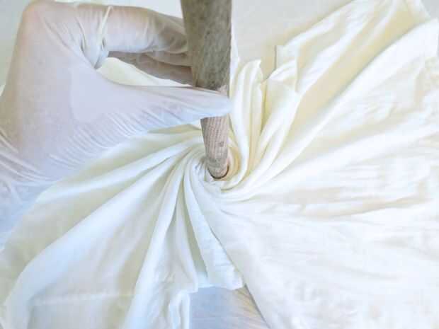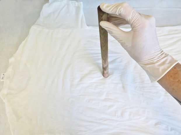 Después de haber remojado y escurrido de la camisa (por cierto, si no hacerlo en la máquina de lavar, tratar de sacar hacia fuera con un amigo!) Coloque la camisa en una superficie plana. Colocarlo derecho hacia abajo, como usted para obtener un patrón más agudo en la parte delantera de la camisa. Por supuesto si desea que el patrón más agudo en la espalda - bueno, usted sabe!