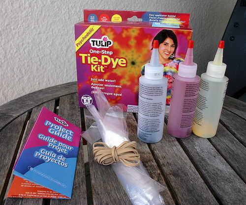 En primer lugar, necesitará reunir los suministros. Usted puede comprar tintes individuales, bandas de goma y guantes o usted puede comprar un kit y todos los que tienen trabajo hecho para usted. Soy perezosa, así que opté por el kit. Tengo éste en de JoAnn con un 40% de descuento cupón, por lo que era cerca de $6. También puede comprar online en Amazon en un montón de combinaciones de color. Voy a mostrarle cómo usar este kit en este tutorial, así que si se opta por un conjunto diferente de materiales, siga las instrucciones para los tintes.