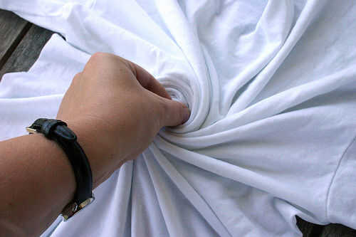 A continuación, pellizcar la camiseta en algún lugar en el centro y empezar a torcer a la tela alrededor. Mantener girando hasta que la camisa entera ha sido torcida en un disco. Como vas, hacer pequeños ajustes aquí y allá así que tiene muchos pliegues y pliegues en la tela. Esto expone a más tela a los tintes y hará un patrón interesante.