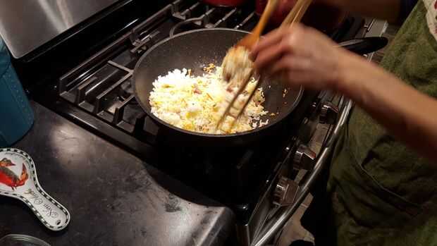 Añadir el arroz en Wok. Mezclar todo con el arroz similar a mezclar una ensalada. Aquí es donde los palillos mano!