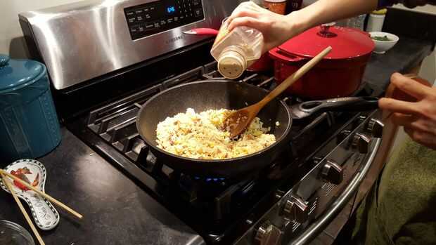 Añadir la sal, la pimienta y la salsa de soja. Mezcla fondo.