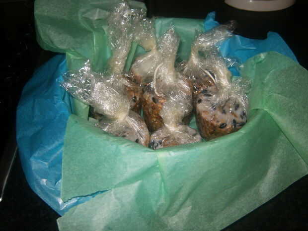 Mi madre se quejaba por no poder poner alpiste fuera más porque sus gatos lo utilizan como cebo para capturar las aves, así que hice este lote para ella. Una vez que han puesto en la nevera, un jarro de agua caliente y algunos aferran película. Sumergir el molde en el agua para suavizar el exterior (unos 30 segundos funcionó para mí) y punta su fatball hacia fuera sobre el film transparente. Envuélvalo para arriba y lo pones de nuevo en la nevera hasta que lo necesite. Pone un papel en una caja bonita y puse el fatballs en él y les dio a mi madre - ella consiguió comida de pájaro puede colgar en ramas muy delgadas (que soporte ligero aves pero no gordos!!!!) así como una bonita caja para almacenar más pulg.