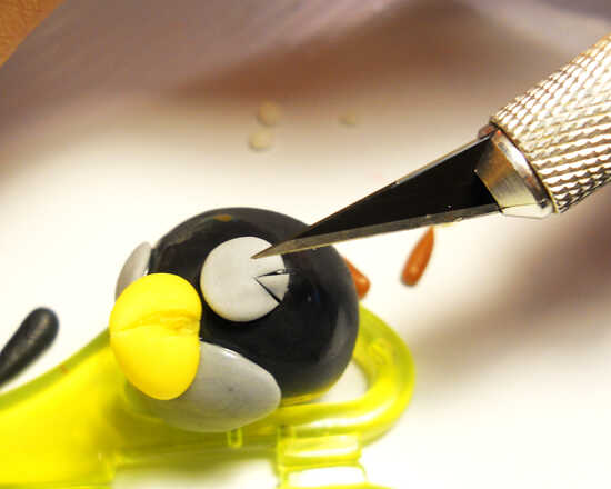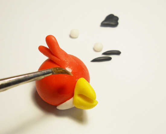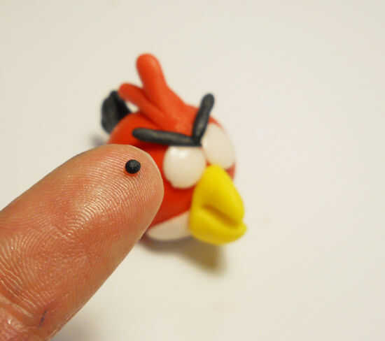 Las pupilas son muy pequeñas. Mucho más pequeño entonces crees que deben ser porque hacen más grandes cuando te los pones. Demasiado grande y tu pájaro se verá raro. Cuando se hacen reconocibles personajes, proporción y escala es importante. Una muy pequeña cantidad de agua se utiliza para pegar a las pupilas en