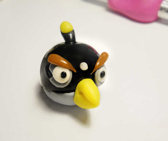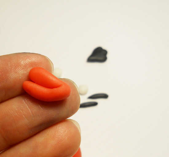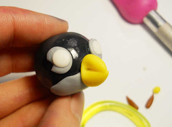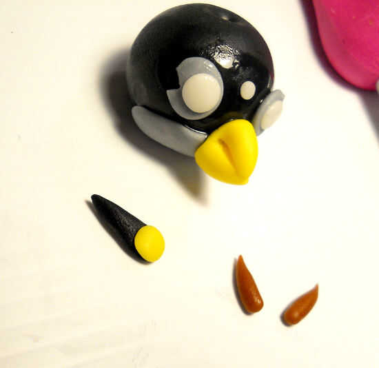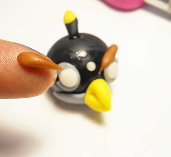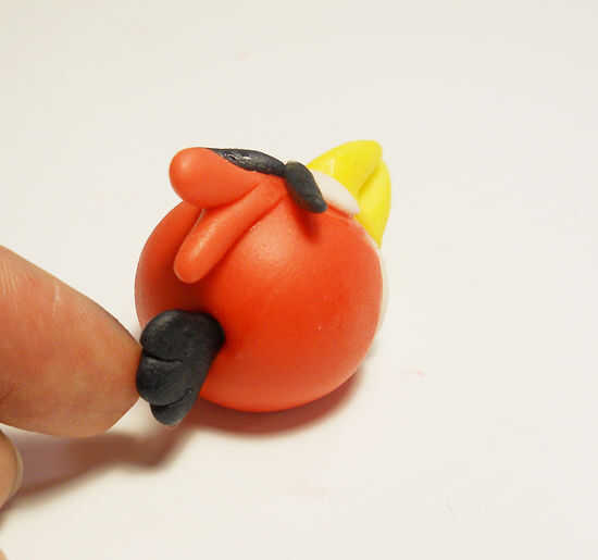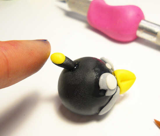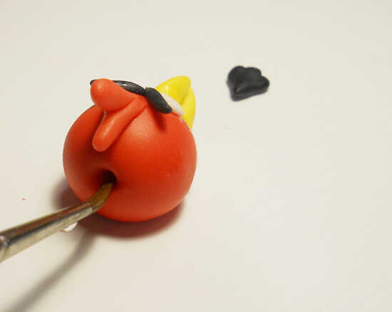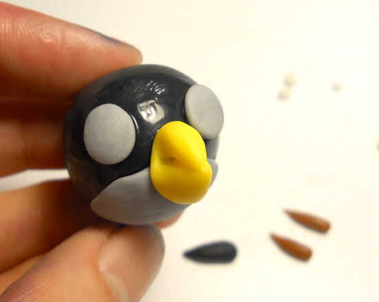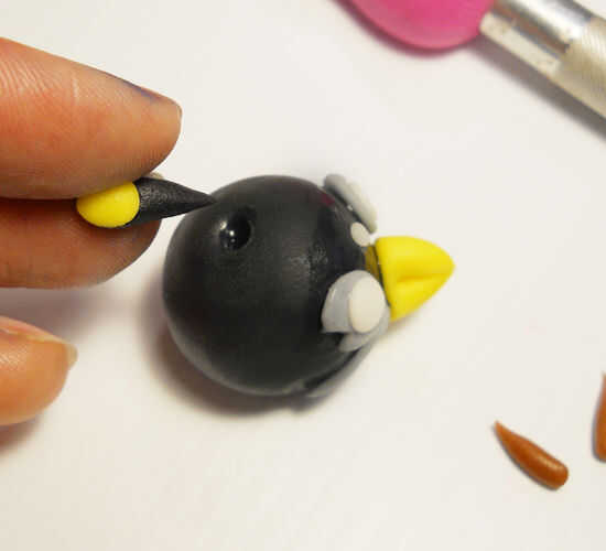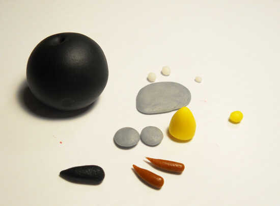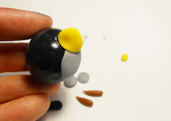 El pájaro negro comienza con una bola del mismo tamaño que el pájaro rojo y esta vez el agujero es en la parte superior. Usted necesitará algunos gris para el vientre y los ojos. Algunos pequeños trozos de blanco de fondant. Dos piezas de fondant amarillo para el fusible y el pico. Otro pedazo de negro para el fusible y un marrón para las cejas. Otra vez, empiezo con agregar el vientre y el pico y con las tijeras para cortar el pico.