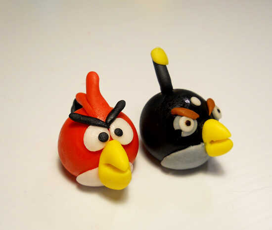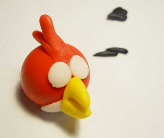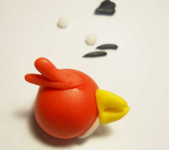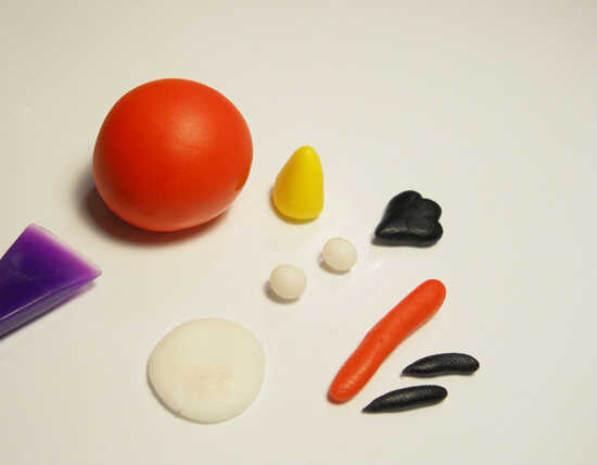 El pájaro rojo es un círculo. Tomar una pequeña cantidad de fondant (sobre el tamaño de kiss de hershey) y rodar en una bola. Haga un orificio en la parte posterior. Esto es donde va la cola. Generalmente deja el cuerpo seco por un día antes de añadir detalles tan su firma pero se puede hacer en un día demasiado. Usted necesitará algunas formas más para el Ave. Algo de blanco para el vientre y los ojos. Negro de SOM para la cola y las cejas. Más rojo para las plumas en la parte superior y algunos amarillo para el pico. Generalmente hago estas piezas como los necesita, pero tenerlos todos aquí para que veas.