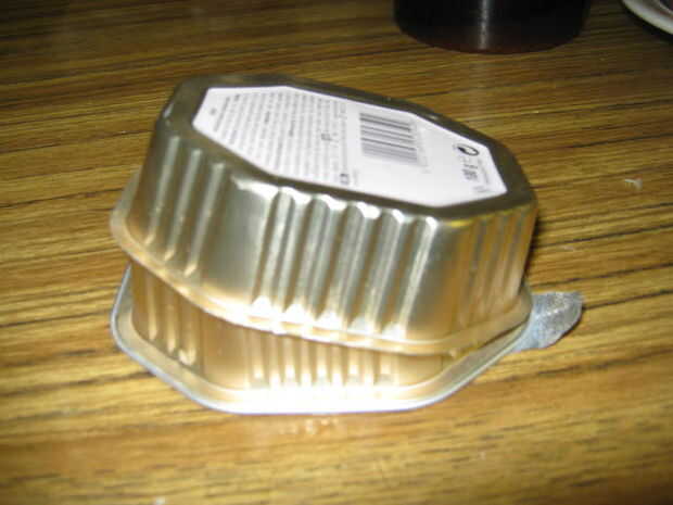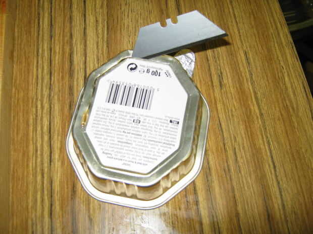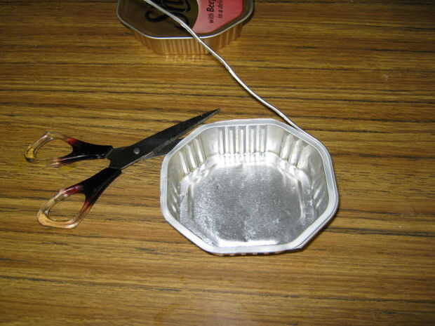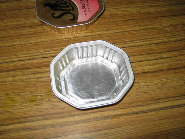Corte con cuidado un agujero en la parte inferior de la otra lata, vaciarla y limpiarla bien.