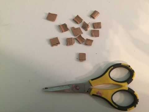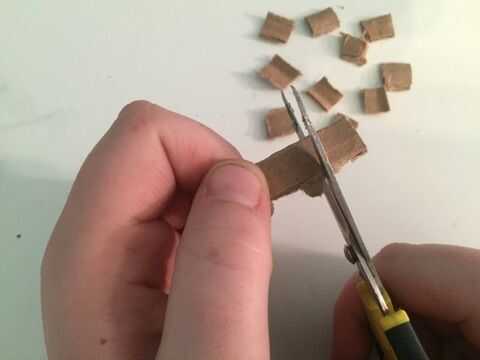 Enchufe por primera vez en la pistola de pegamento caliente para que se calienta por el paso siguiente. Asegúrese de poner un pedazo de papel debajo de él. Luego tomar la tijera y cortar pequeños cuadrados de papel y cartón.