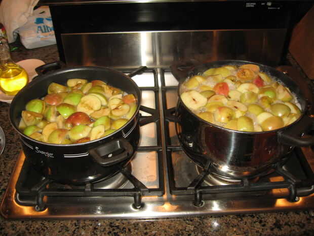 1 o 2 grandes ollas de hervir agua con un relleno de pasta o un grande ranuran cuchara para retirar las manzanas.