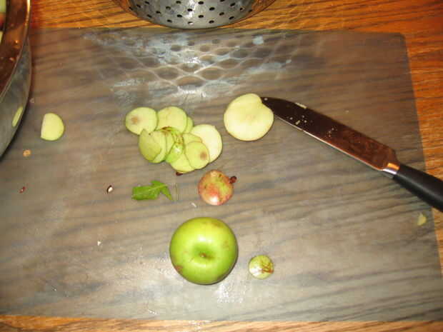 Todos los pasos se realizan al mismo tiempo, terminó de cortar más rápido que pudimos cocinar y molino, pero no quería mantener cortadas las manzanas para dorar en el tiempo tomaron para terminar un lote.
