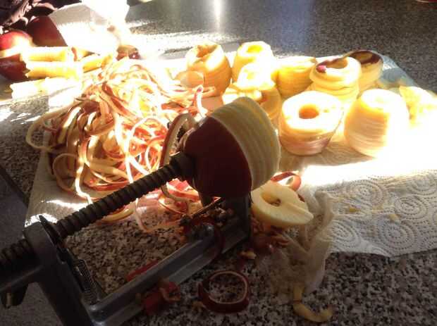 Puede utilizar un pelador de manzana como en la imagen para pelar y cortar las manzanas. Si no tienes uno puedes pelar y cortar las manzanas manualmente. Si cualquier semillas, piel o base queda en las manzanas que esto resultará en partes duras está en el puré de manzana. Asegúrese de que usted quite.