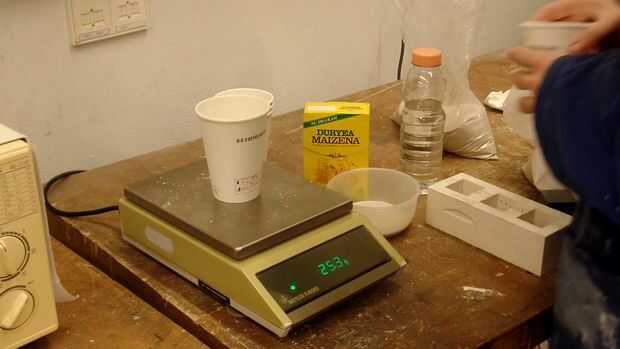 Almidón de maíz es el cemento de este material. Es importante que el almidón de maíz seco para que influye en la exactitud de las mediciones. Tienda comprada almidón de maíz contiene un porcentaje de agua, por tanto, menos agua se debe agregar en este caso.
