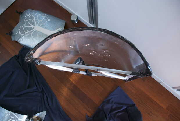 Remache de extremo de las barras de la T a la chapa (una barra en la parte superior) y uno cerca del fondo, control de imagen, de la pantalla, esto requerirá que el metal de la flexión (ahí el aluminio) modo que curvee muy bien. Dependiendo de la longitud de la barra de "T", se curva más o menos. La curva final debe hacer el escudo un poco más a ti mismo. Utilice a un amigo si necesitas ayuda con esto.