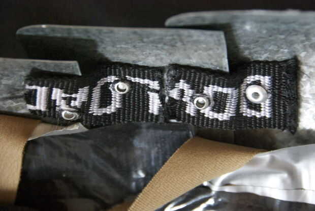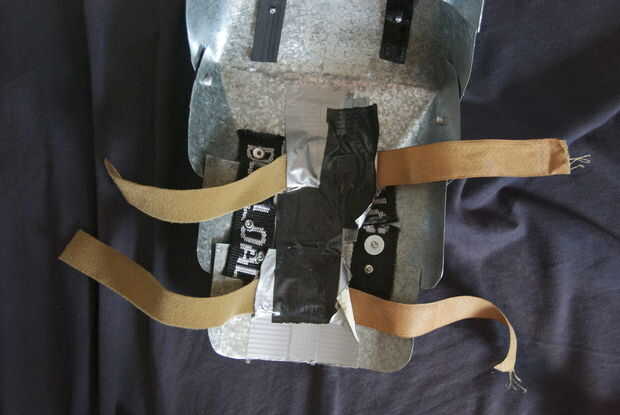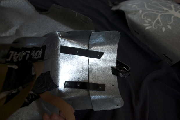 Tomar las tiras de velcro y cinta con cinta adhesiva, 2 de ellos, en la parte superior y de la parte inferior de la sección de la tira de metal que se apoya en el brazo. Ahora eres capaz de atar la hombrera en le brazo y mover la pieza del hombro. Probar.
