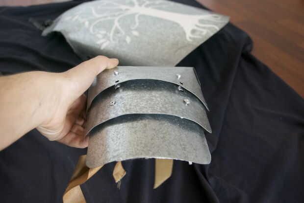Una vez que estés feliz con cómo la armadura de la placa parece en tu hombro, ir cortarse unas tiras de metal, aproximadamente 10cm de ancho y la longitud de su anchura de hombreras (si es que no tiene sentido, simplemente creo que deberían ser las tiras tan largas como la anchura de sus hombreras y 10cm o de 3,9 pulgadas de ancho) hacen sobre 6-10 de ellos , dependiendo de cómo desea su hombreras para parecerse a. Curva de estas tiras en el Banco para que tengan la misma curvatura como su pauldons.