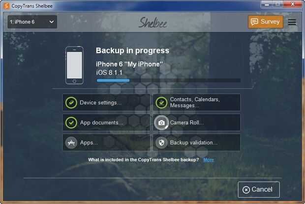 CopyTrans Shelbee respalda todos los datos de iOS incluyendo configuración de iPhone, aplicaciones iPhone, mensajes, contactos, calendarios y Camera Roll.