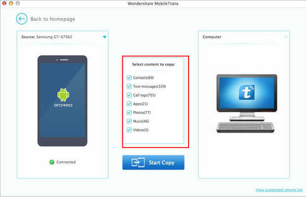 Debe elegir los datos de la caja. Luego haz clic en el botón Iniciar copia y seleccionar una carpeta local para almacenar los datos de backup. No desconecte el teléfono android durante este proceso.