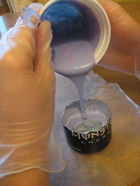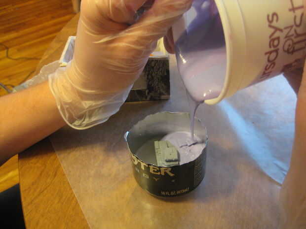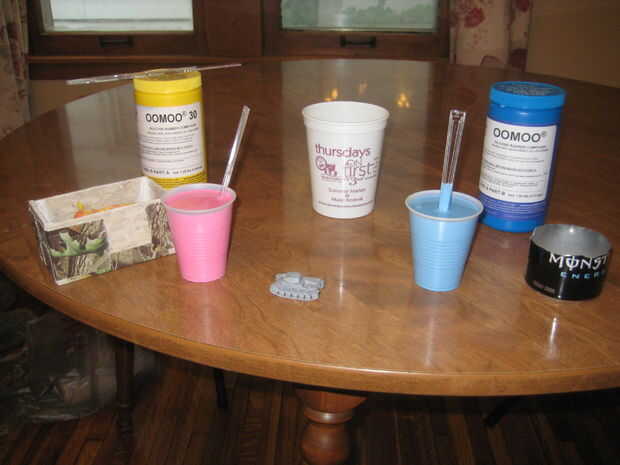 Mezclar la silicona conforme a las instrucciones en la caja / sitio Web. Si estás realmente perdido, usar videos para guiarte. En este caso, compré un tipo que puede utilizar cantidades iguales, por lo no complicado medir era necesario. Simplemente llena dos vasos pequeños de partes iguales, luego vierte en un recipiente más grande y revuelto. Tenga en cuenta, tienes una cierta cantidad de tiempo antes de que la silicona se solidificará (en este caso, media hora) para adivinar antes de tiempo cuánto tiempo tomará para mezclar y verter. Realmente fui a caballo la línea en este caso, así que nada más grande que este vertido podría tomar más de media hora.