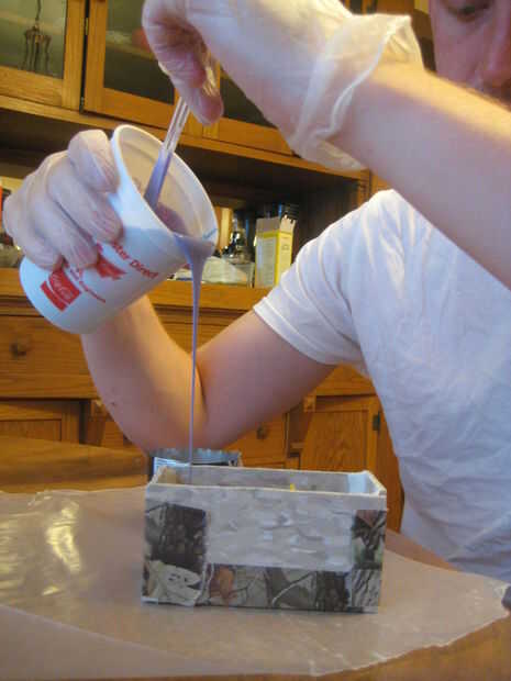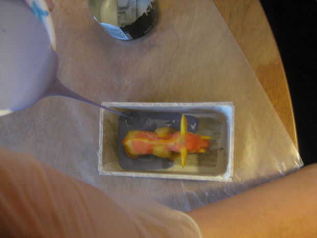 Vierta en el molde en una esquina, lejos de la pieza. No la vierta sobre la pieza, pero dejar que fluya alrededor de la pieza. Si es posible, levante el recipiente para que la corriente está vertiendo en sólo un filamento delgado. Todo esto debe impedir que burbujas formando sobre la pieza misma. No es infalible, pero es la mejor manera de garantizar un buen producto final.